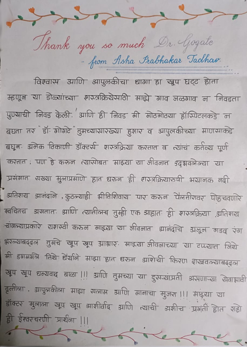 We were deeply honoured to welcome Padma Shri Dr. Tatyarao Lahane, one of India’s most respected ophthalmic surgeons and former Dean of J.J. Hospital, Mumbai, to Dr. Gogate’s Eye Clinic on 24th May 2025. Dr. Lahane is renowned globally for performing a record number of cataract surgeries and for his dedication to making quality eye care accessible to all. His contribution to preventive blindness and community eye health has inspired generations of doctors and healthcare professionals.